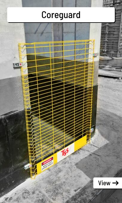 TSS Shaftgate is an adjustable gate that protects the open edges of Staircase Cores and Lifts shafts. TSS Coreguard is a fixed protection steel mesh that protects the open edges of Staircase Cores and Lifts shafts.