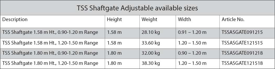 TSS Shaft gate takes all the safety measures into consideration and utilizes a quick and changeable fixing method to ensure a secure and safe method of protecting the openings.